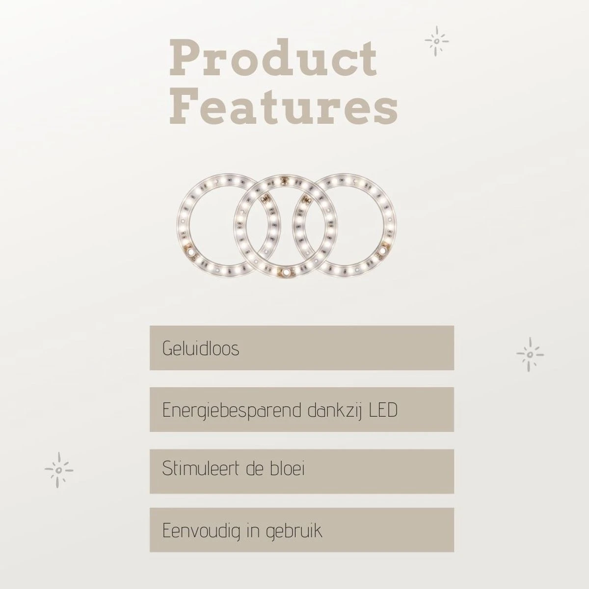 De groeilamp bevat drie ringen met warm witte LED chips die de bloei van gewassen stimuleert
