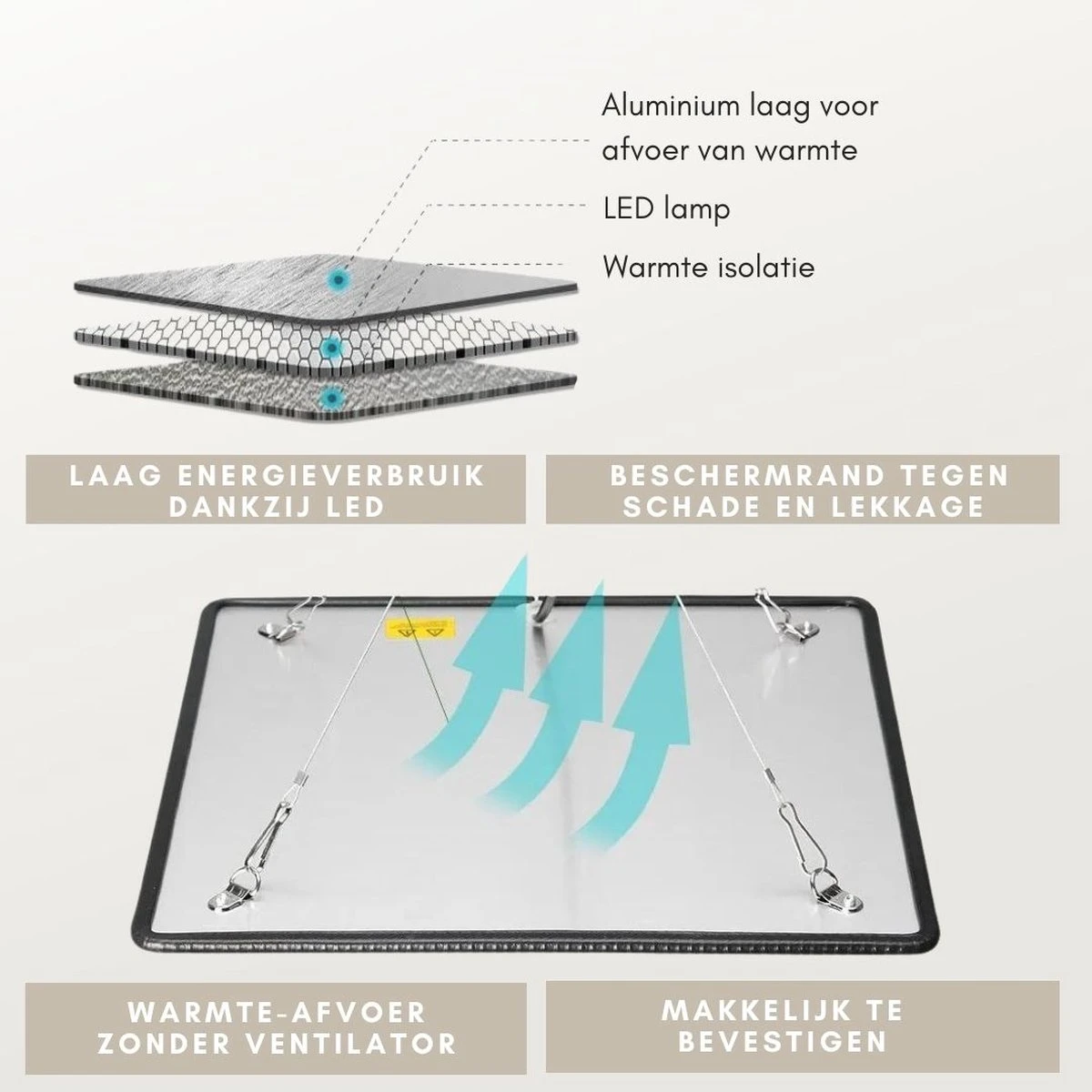 Deze full spectrum LED kweeklamp wordt geleverd met een ophangsysteem en een driver (230V voeding). Doordat er geen behuizing om het LED paneel heen zit, is deze zeer dun. Door de bijgeleverde externe voeding, hoeft het systeem niet gekoeld te worden. De lamp kan zonder behuizing boven de planten worden gehangen.