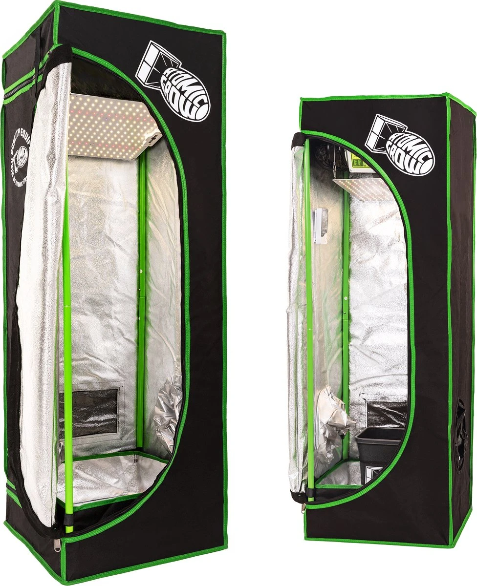Tent is extra robuust en voorzien van extra reflecterend folie voor maximale lichtverdeling. Door het extra sterke en dikke nylon van de tent heb je volledige lucht en lichtdichtheid. De ritsen zijn extra sterk en afgewerkt met extra nylon achter de ritsnaad voor maximale licht isolatie.