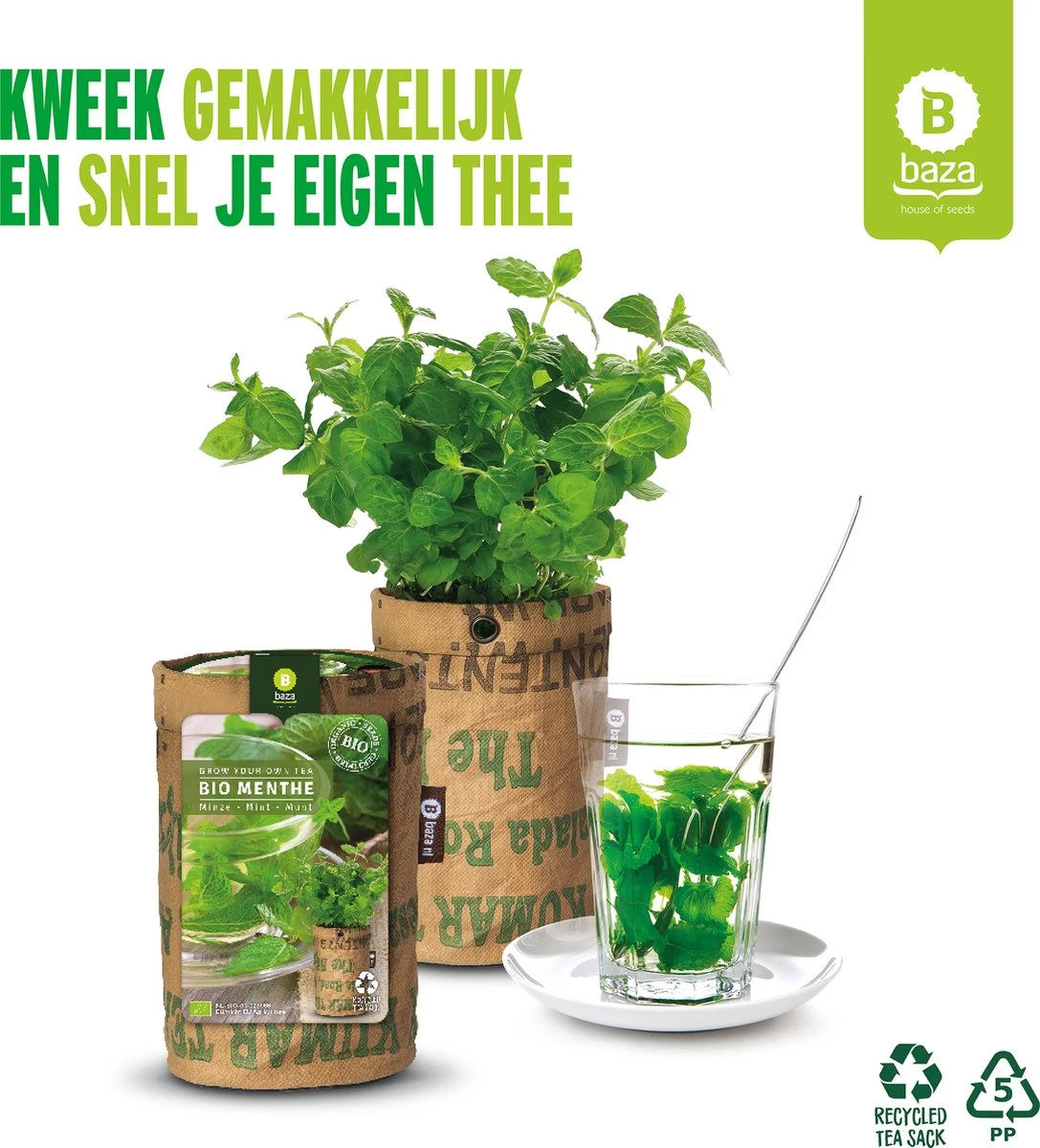 Kweek het hele jaar door thuis op de vensterbank, of op je balkon of terras heerlijke verse muntthee! Gemakkelijk te kweken. De kweekzakken zijn hergebruikte oogstzakken en komen ook echt uit India. Hier worden ze onder vriendelijke omstandigheden, en voor een nette beloning, met de hand gemaakt.