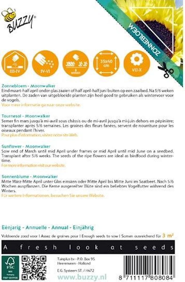 Zonnebloem Moonwalker is een srchitterende zonnebloem met zachtgele bloemen met een donker hart. Vormt talrijke vertakkingen met bloemen. De zaden van uitgebloeide planten zijn heel goed te gebruiken als wintervoer voor de vogels. Eind maart – half april onder glas of half april t/m mei buiten op zaaibed; 5-6 weken na de uitzaai uitplanten.