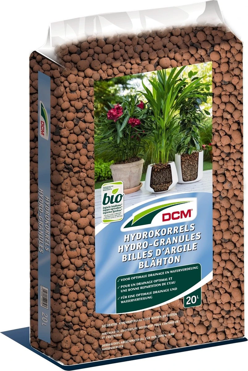 Gebakken en gewassen korrels van zuivere klei die veilig zijn voor de planten. Voor een optimale drainage en waterverdeling in potten. Ook geschikt als decoratief afdekmateriaal voor binnen en buiten. Maakt grote potten minder zwaar. Toepasbaar in de biotuin.