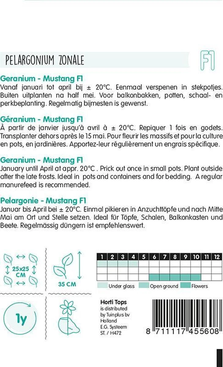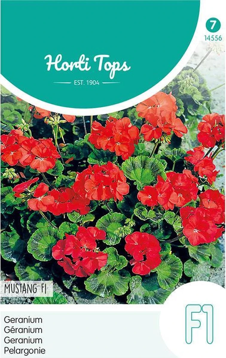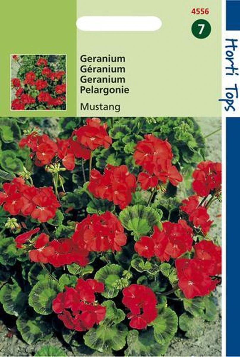 Geranium – Mustang F1. Vanaf januari tot april zaaien bij ± 20°C. Eenmaal verspenen in stekpotjes. Buiten uitplanten na half mei. Voor balkonbakken, potten, schaal- en perkbeplanting, Regelmatig bijmesten is gewenst.