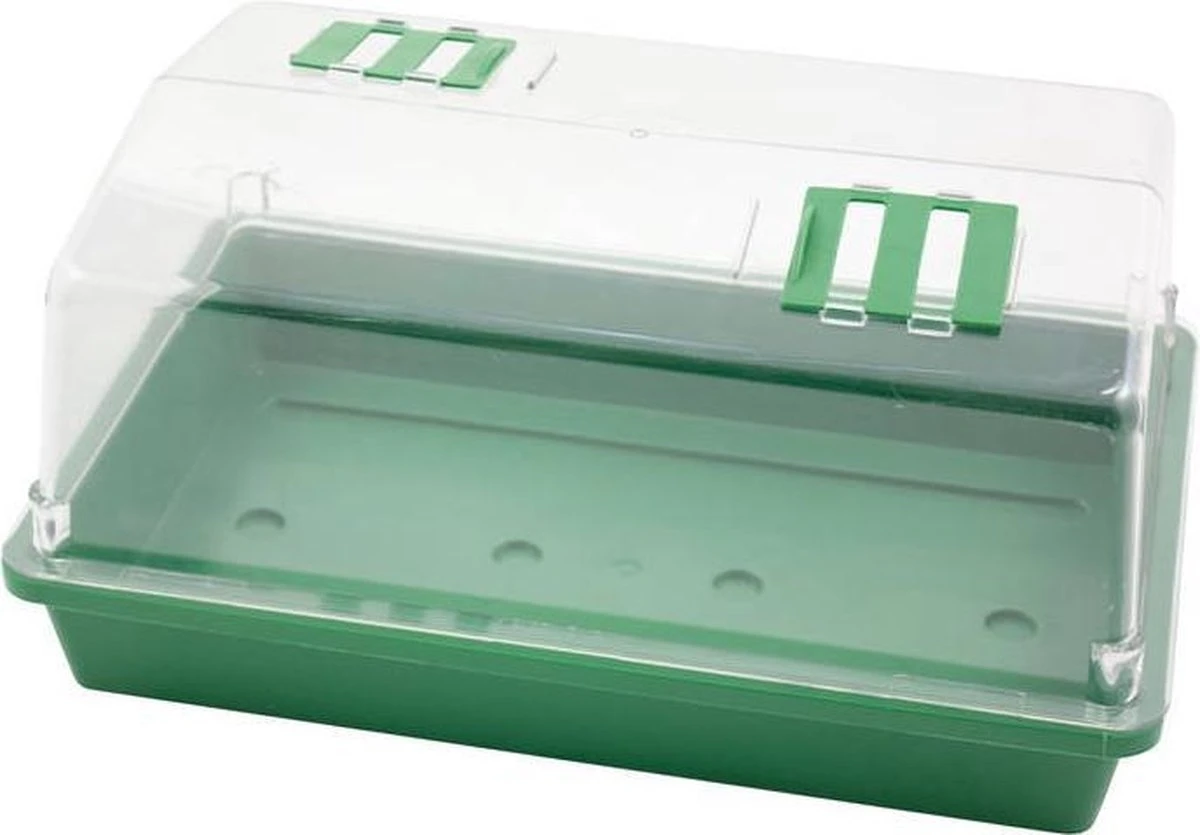 Kweekbak/kweekkast van kunststof met deksel 18 x 38 x 12 cm. Wordt geleverd zonder trays/kweekpotjes/turfpotjes. Kweekbak/kweekkastje met deksel om zaden van bijvoorbeeld kruiden of groente in te planten en te laten ontkiemen tijdens de koudere maanden. De deksel bevat ventilatieopeningen voor een optimale regeling van de temperatuur en vochtigheidsgraad. Vul de bak met aarde, leg de zaden erop, duw ze in de aarde en zet ze binnen op een lichte plaats (bijvoorbeeld in de vensterbank). Zodra het plantje ca. 6 cm hoog is kunt u deze, mits het niet meer vriest, overplanten in de tuin of in een buitenpot plaatsen. Propagators voor de vensterbank, keuken, tuin en moestuin.