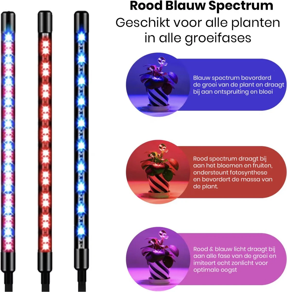 Deze lamp beschikt over drie verschillende spectrum lichtbronnen – rood, blauw- en paars – die samen zorgen voor de perfecte combinatie van licht die uw planten nodig hebben voor een gezonde groei.