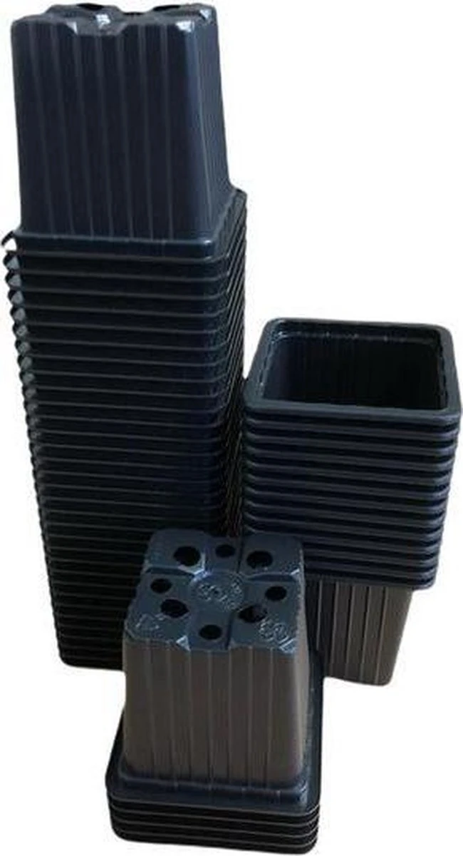 Zwarte vierkante plantpotjes met een eersteklas bodem voor optimale afwatering en ventilatie, ook voor irrigatie met irrigatiematten. De kweekpotten zijn van hoge kwaliteit waardoor ze meerdere keren mee kunnen voor hergebruik.