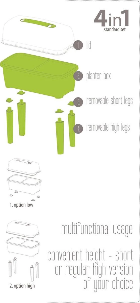 Door de verwijderbare onderzetpoten kan men kiezen uit 2 gebruiken: de lage versie of de hogere versie. Ideaal om deze ook tijdens de winter als gewone bloembak binnen te zetten en te gebruiken.