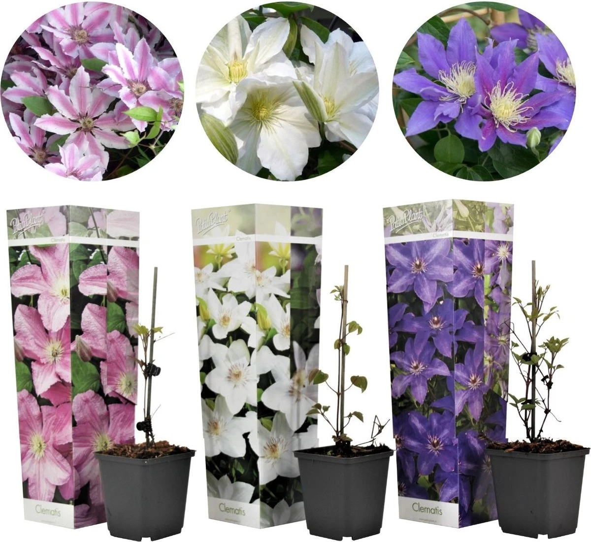 De Clematis, ofwel Bosrank, is al honderden jaren een van de populairste tuinplanten. Zelfs de oude Grieken en Romeinen waren naar verluid al fan. Doordat de Clematis al sinds de oudheid populair is, zijn er inmiddels vele kruisingen te verkrijgen. De Clematis wordt ook wel de koningin van de klimplanten genoemd. Ze is namelijk makkelijk te verzorgen, heeft een lange bloeiperiode en bestaan in alle soorten, kleuren en maten. In deze mix zitten 3 heel verschillende Clematis klimplanten, namelijk de volgende soorten: