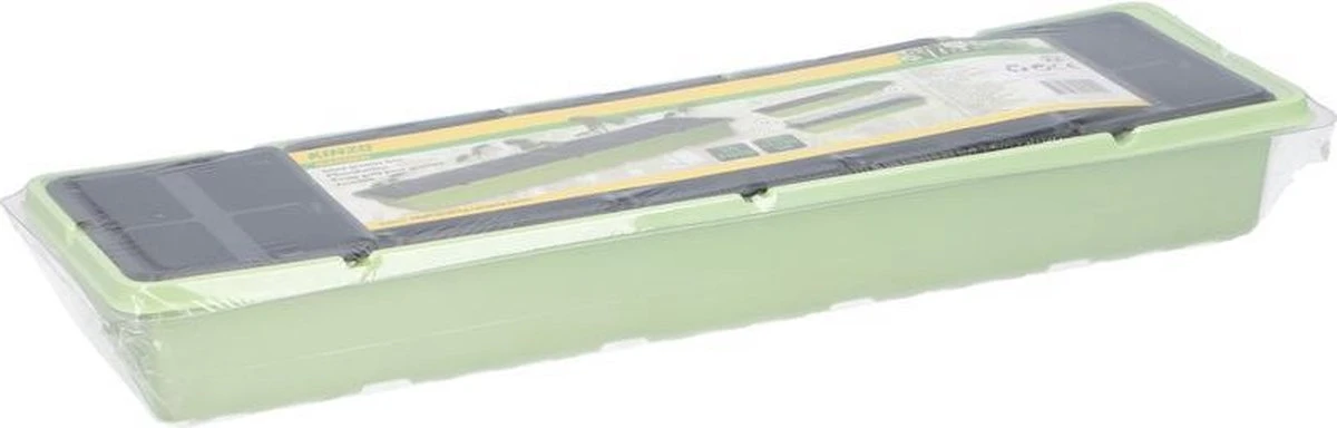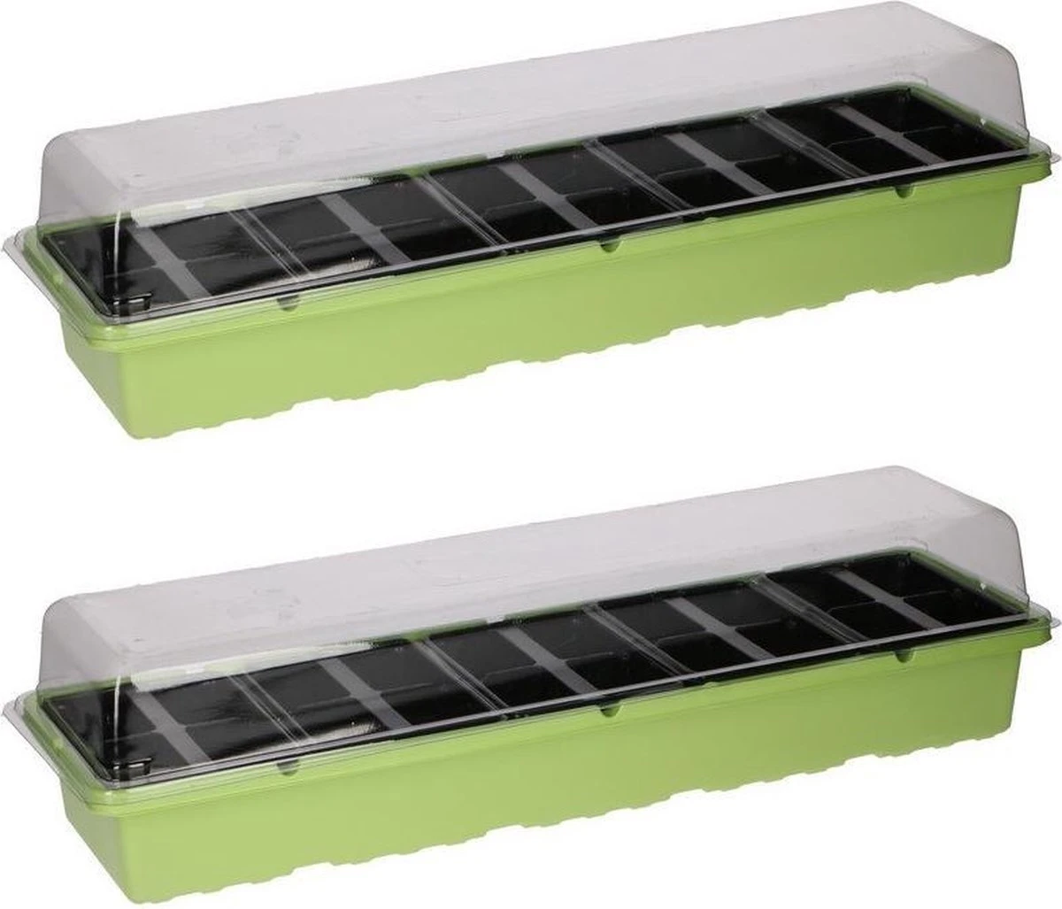 2x Kweekbak/zaaibak 20 vakjes transparante deksel 53 cm. Kweekbakken/kweekkastjes met 20 kweekvakjes met transparante deksel om zaden van bijvoorbeeld kruiden of groente te kweken. De 20 zaaivakjes zijn per 4 uitneembaar. Vanwege het praktische formaat ideaal voor in de vensterbank. Voor binnen- en buitengebruik. Vul de bak met aarde, leg de zaden erop, duw ze in de aarde en zet ze binnen op een lichte plaats. Zodra het plantje ca. 6 cm hoog is kunt u deze, mits het niet meer vriest, overplanten in de tuin of in een buiten pot zetten! Afmeting: ca. 53 x 14,5 x 8 cm. Materiaal: kunststof. Kweekkastjes/kweekbakken voor de vensterbank, keuken, tuin en moestuin. U ontvangt 2 stuks.